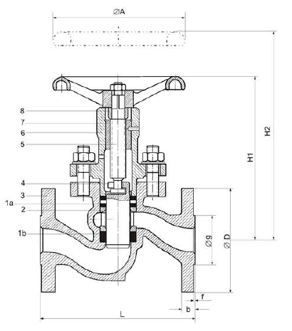 | DN | CUERPO | CONEXIÓN | Peso Aprox. (Kg.) | pulg. | mm. | L | H1 | A | H2 | D | b | g | f | DIN 2535 |